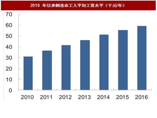而 10 至 19 歲的人口數(shù)量占比在逐年減少。此消彼長之下,未來五年內(nèi),可工作人口數(shù)量將逐年減少。與此同時(shí),制造業(yè)人員工資水平近年來也一直呈現(xiàn)增長趨勢(shì),從 2010 年的 30916 元/年上升到 2016 年的59470 元/年,年均復(fù)合增速達(dá)到 11.52%。可以預(yù)見,未來的五年內(nèi),中國 20至 60 歲的可工作人口數(shù)量將不斷減少,制造業(yè)用人將變得愈加困難;而制造業(yè)工人工資水平的逐年上升將會(huì)增加企業(yè)用工成本。