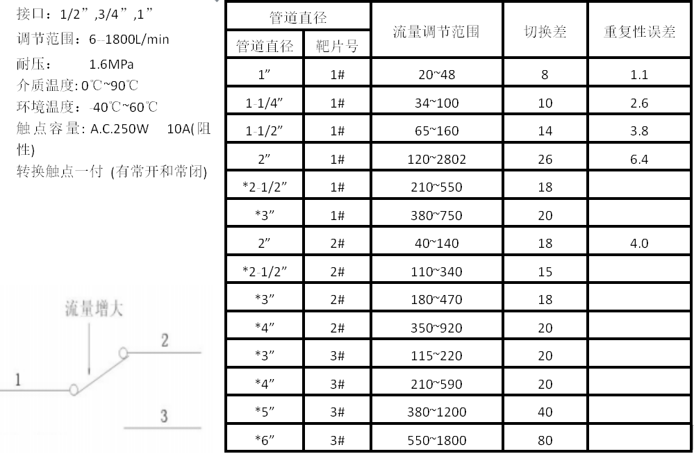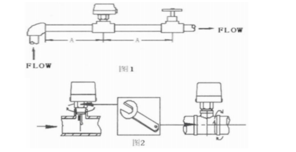 1.安裝前請仔細檢查流量開關(guān),包裝應(yīng)完整,外觀應(yīng)無損傷及變形。如有問題,請與生產(chǎn)廠家聯(lián)系;2.流量開關(guān)可安裝在水平管道或液流方向向上的垂直管道中,但不能安裝在也流向下的管道中。當(dāng)安裝在液流向上的管道中,用考慮重力影響。3.流量開關(guān)一定要安裝一段支線管道上,其兩邊至少5倍管徑的直線行程,同時應(yīng)注意管道中液流方向必須與開關(guān)外殼上的箭頭方向一致,其接線端子應(yīng)在易于接線的位置;(圖1)4.安裝接線時,請注意以下事項:*絕對禁止扳手碰撞開關(guān)底板,導(dǎo)致流量開關(guān)變形失效;*為避免觸點及損害設(shè)備,在接線或進行調(diào)試時,應(yīng)切斷電源;*接線時,絕對禁止調(diào)節(jié)微動開關(guān)接線端子,接地螺絲外的其它螺絲。并應(yīng)注意,微動開關(guān)接線時不能用邊過猛,否則易使微動開關(guān)本身位置移位,導(dǎo)致流量開關(guān)失效;*接線必須使用專用接地螺絲,不能隨意拆卸安裝螺絲釘,否則將導(dǎo)致控制器變形失效;*流量開關(guān)的靶片不能與管道內(nèi)壁及管道中其它節(jié)流器相接觸,否則容易導(dǎo)致開關(guān)不能正常復(fù)位。