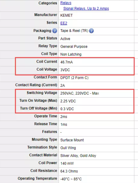 舉個例子。圖3顯示了DigiKey網(wǎng)站上的隨機繼電器的產(chǎn)品屬性。圖中突出顯示的線圈值描述了繼電器消耗的電流以及可以與繼電器一起使用的最大電壓。在這種情況下,它是3V繼電器,因此您需要確保您的項目可以提供3伏電壓來觸發(fā)繼電器,否則它將無法正常工作。